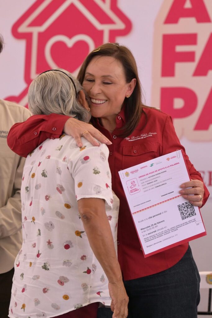 En la Unidad Deportiva ESBIO de San Andrés Tuxtla, la Mandataria encabezó el arranque y primera entrega de los programas Apoyo a la Palabra y Apoyo a la Familia, estrategia conjunta de la Secretaría de Desarrollo Social y el Sistema Estatal DIF que, en 2026, se extenderá a 112 municipios con una inversión global de 200 millones de pesos.