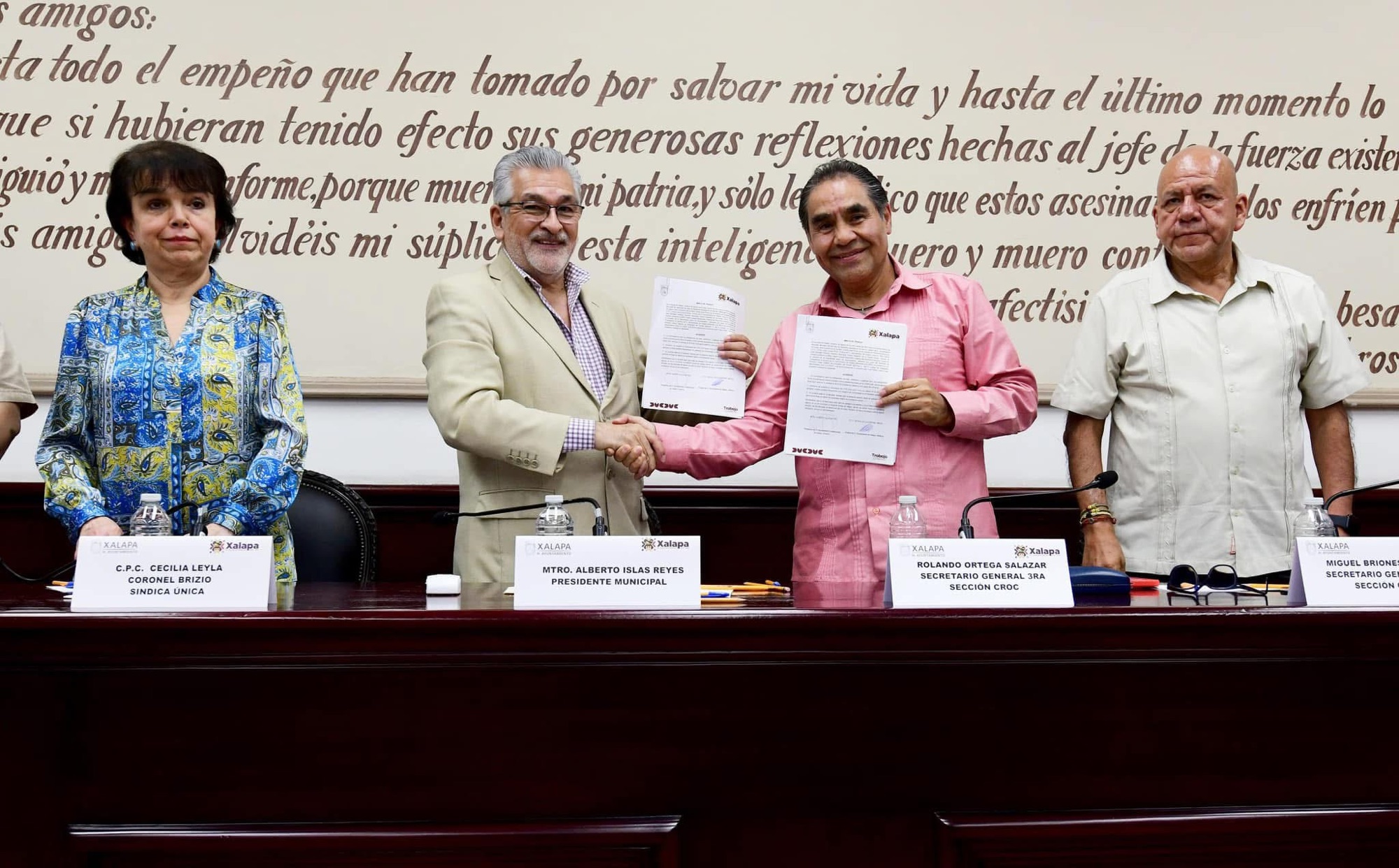 Xalapa, Ver.; 4 de marzo de 2025.- Los empleados sindicalizados son el motor del Ayuntamiento y pilar de toda la actividad municipal, por lo que se reconoce su labor, liderazgo y solidaridad con la Administración, afirmó el alcalde Alberto Islas Reyes durante la firma del convenio correspondiente a la Revisión Salarial 2025, que se realizó con el Sindicato de Trabajadores al Servicio del Ayuntamiento adherido a la CROC.