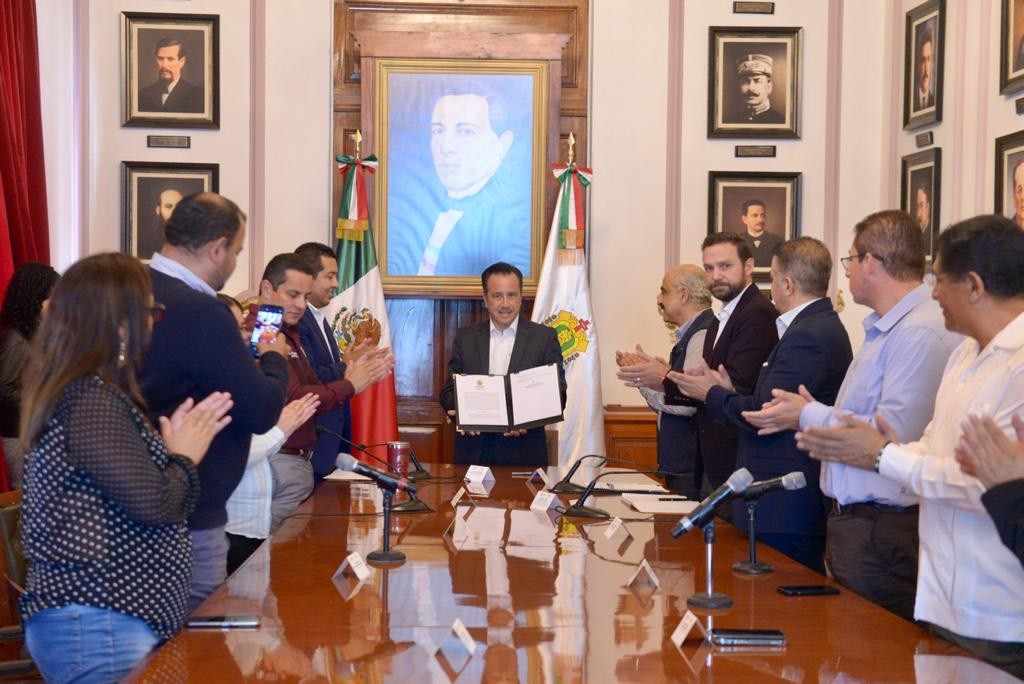 Cuitláhuac García Jiménez, gobernador de Veracruz, en la signatura del documento. Lo acompañan los alcaldes de la región encabezados por Ricardo Ahued Bardahuil, alcalde de Xalapa.
