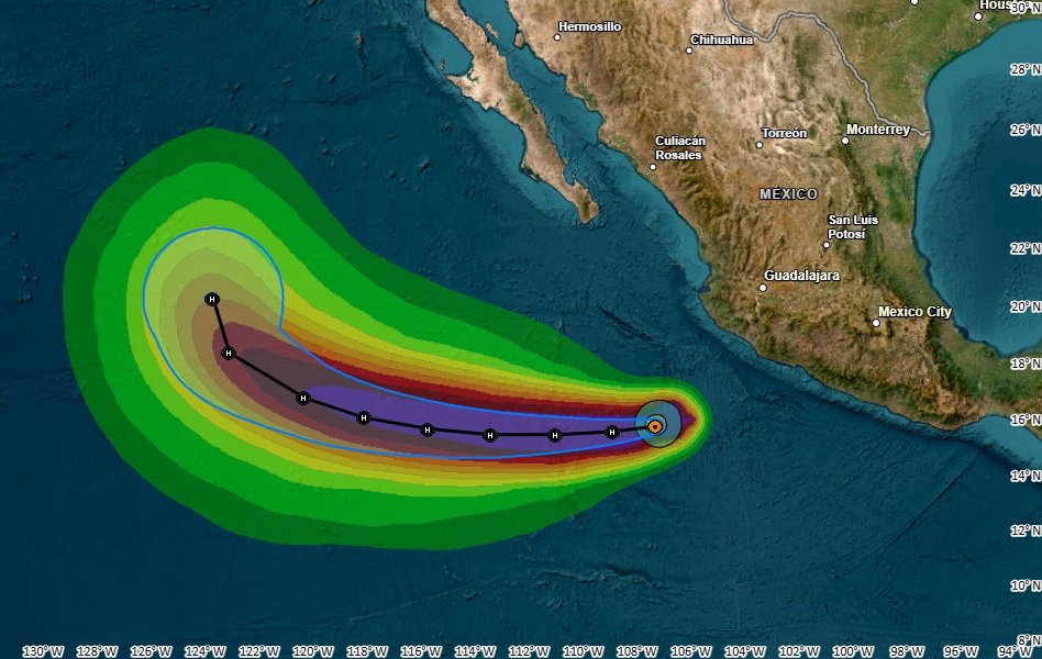 – La Comisión, dio a conocer que el centro del huracán se localizó a 475 kilómetros (km) al suroeste de Manzanillo, Colima.