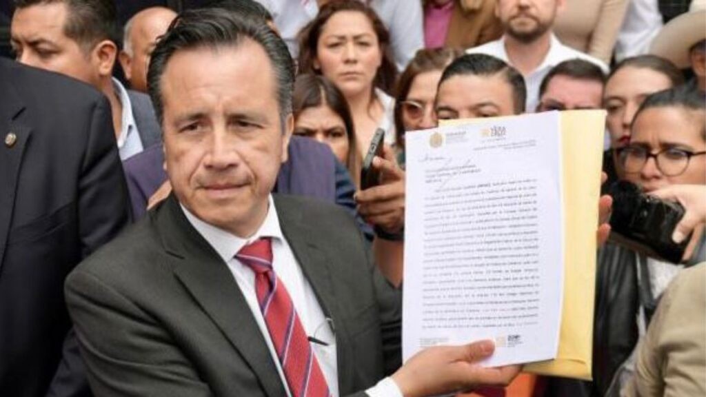Xalapa, Ver., 16 de Mayo de 2023.- Este día, Cuitláhuac García Jiménez, gobernador de Veracruz, presentó denuncia formal ante la Fiscalía General de la República en contra de los jueces Cuarto y Quinto, José Arquímedes Gregorio Loranca Luna y Mario de la Medina Soto por presuntamente encubrir actos ilegales en la construcción de la Torre Centro en la ciudad de Veracruz.
