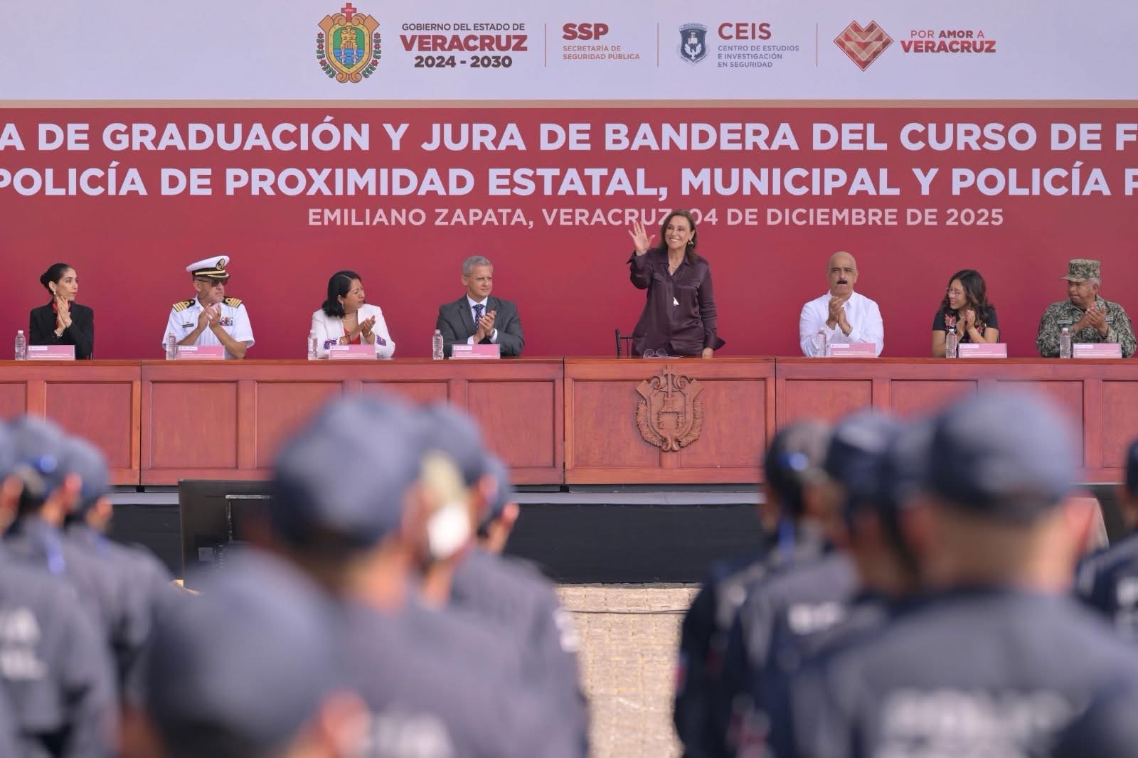 Durante Ceremonia de Graduación y Jura de Bandera del Curso de Formación Inicial para Policía de Proximidad Estatal, Municipal y Policía Penitenciario exhortó a la nueva generación a desempeñarse con honor, integridad y profesionalismo. “Estoy segura de que sabrán hacerlo con honor, integridad y compromiso ¡Veracruz está en buenas manos!