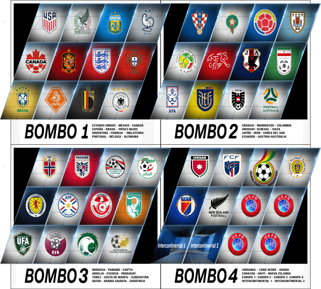 Los anfitriones Canadá, México y Estados Unidos ocuparán un lugar destacado en el sorteo al estar ubicados en el Bombo 1, acompañados por potencias como España, Argentina, Francia, Inglaterra y Brasil. México será asignado directamente a la posición A1, Canadá a la B1 y Estados Unidos a la D1, cada uno identificado con una bola de color específico para evitar confusiones durante el procedimiento. Las otras nueve selecciones del bombo 1 serán asignadas automáticamente a la posición 1 del grupo que les corresponda.