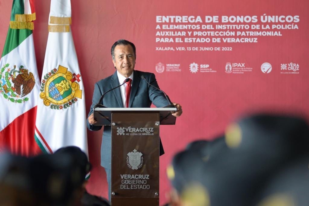 Xalapa, Ver., 13 de junio de 2022.- El gobernador Cuitláhuac García Jiménez celebró que el Instituto de la Policía Auxiliar y Protección Patrimonial (IPAX) tenga finalmente sus cuentas en orden y pueda ofrecer mejores servicios y condiciones de trabajo a su personal, que este día recibió un bono único en reconocimiento a su vocación.