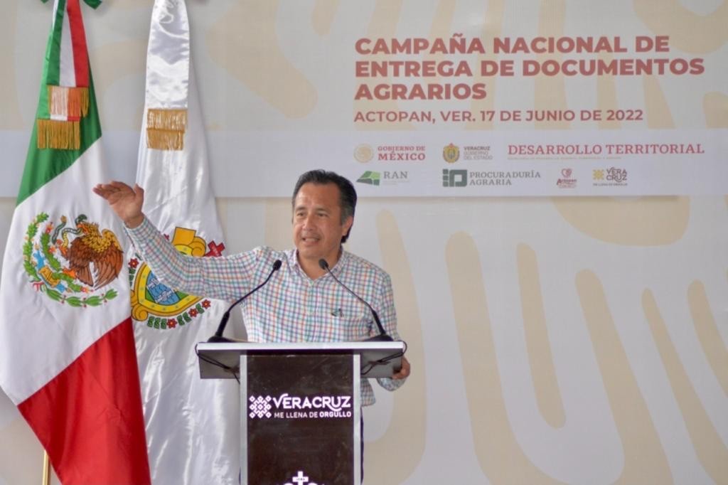 Actopan, Ver., 17 de junio de 2022.- Con la cesión de títulos parcelarios en El Higo, Úrsulo Galván, Tierra Blanca y Actopan, la Cuarta Transformación ha impuesto récord al abatir el rezago y los abusos contra el sector agrario, destacó el gobernador Cuitláhuac García Jiménez durante la entrega de 611 documentos este viernes.
