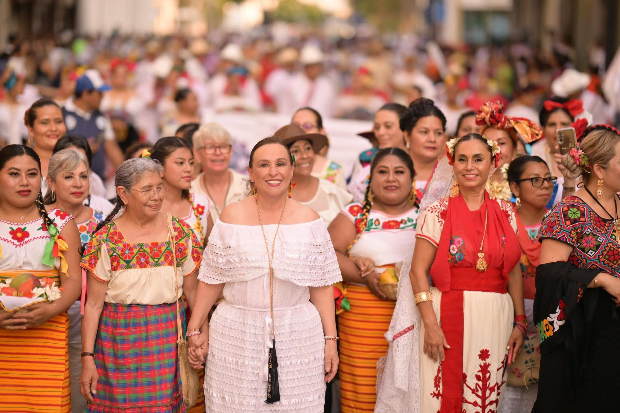 Mil 168 personas integraron los contingentes que partieron del sur, en homenaje a los olmecas como cultura madre, y culminó en el norte, encabezado por la región Sotavento. La Mandataria fue acompañada por representantes de cada región, portando un típico traje de jarocha.
