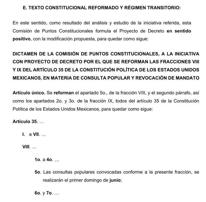 En caso de aprobarse por el Congreso de la Unión, la iniciativa modificaría el artículo 5 de la Constitución, que actualmente dice textualmente que “las consultas populares convocadas conforme a la presente fracción, se realizarán el primer domingo de agosto”.