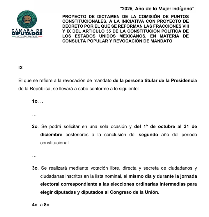 – Proponen que la consulta de Revocación de Mandato presidencial se realice el mismo día de las elecciones intermedias de 2027, cuando se renovará la Cámara de Diputados.