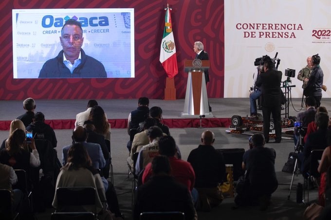 Oaxaca de Juárez, Oax.; 1de junio de 2022.- Alejandro Murat Hinojosa, gobernador de Oaxaca, a través de videoconferencia con el Presidente López Obrador, señaló que “hay afectaciones en viviendas, en siete municipios se iniciaron, los vemos, y hoy llegan 10 mil despensas, que el Ejército y la Marina hará la dispersión”.