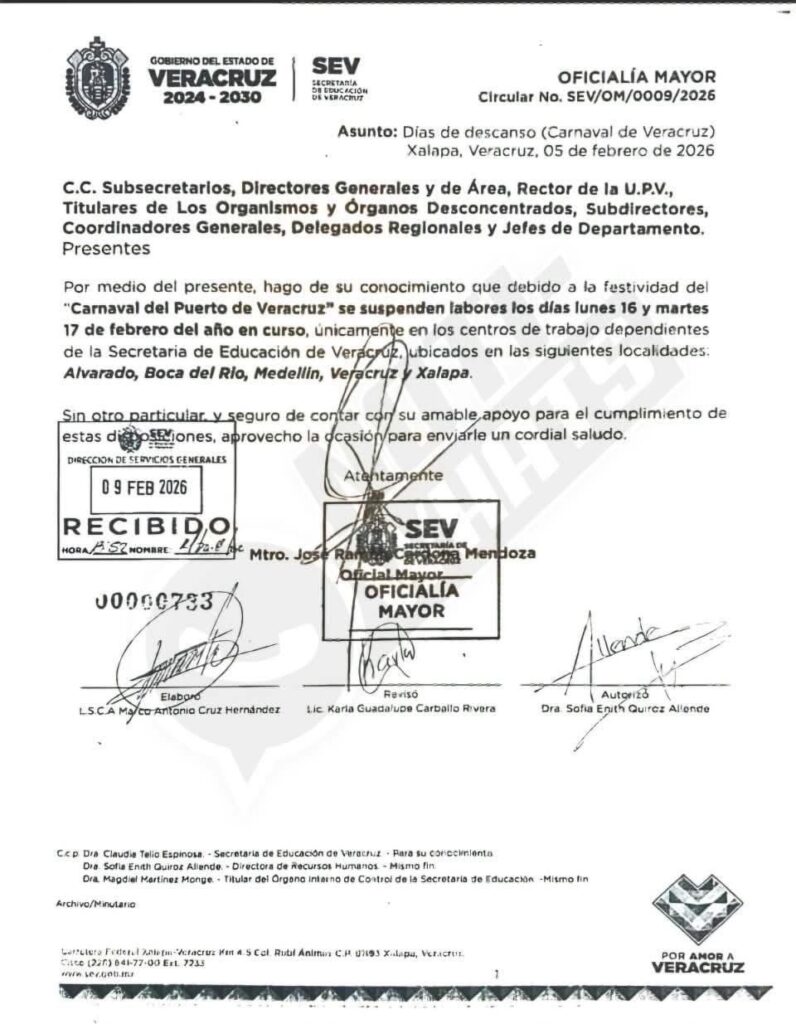 Xalapa, Ver.; 9 de febrero de 2026.- Con motivo de las festividades del Carnaval, la Secretaría de Educación de Veracruz (SEV) suspenderá las labores escolares durante los días 16 y 17 de febrero del año en curso en los municipios de Alvarado, Boca del Río, Medellín, Veracruz y Xalapa.