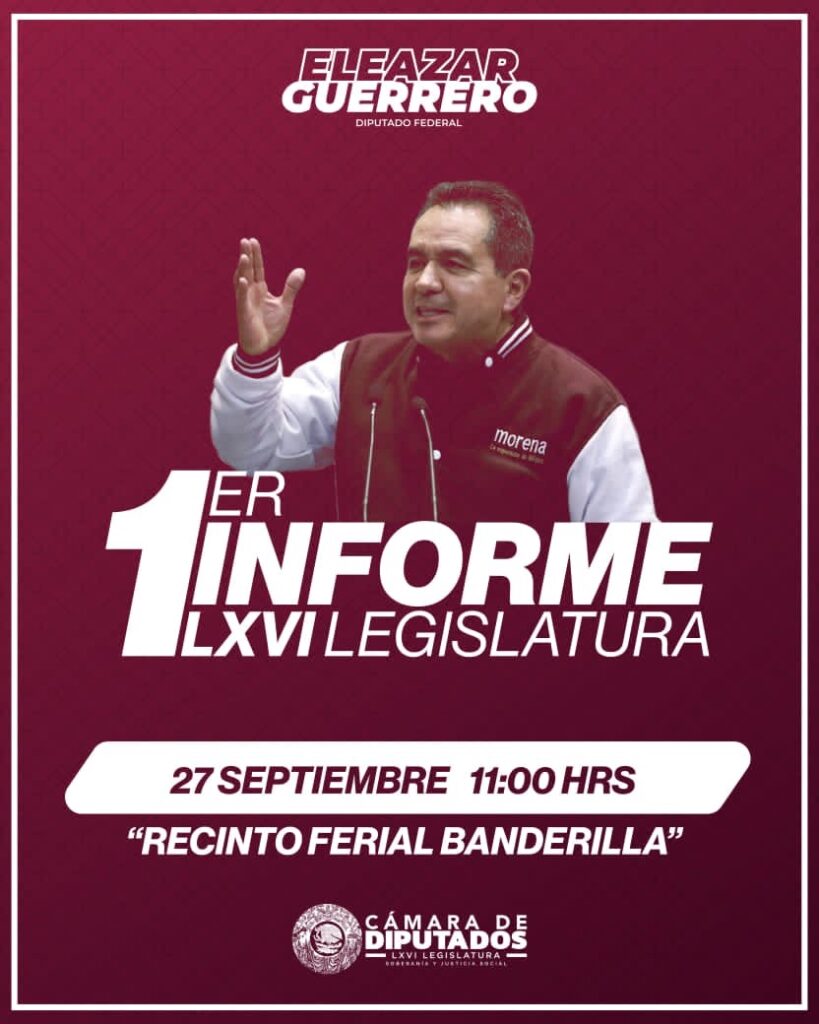 Xalapa, Ver.; 18 de septiembre de 2025.- El diputado federal Morenista, Eleazar Guerrero Pérez, presentará su Primer Informe de Labores de la LXVI Legislatura Federal. La cita será el próximo 27 de septiembre a las 11:00 horas, en el Recinto Ferial de Banderilla.