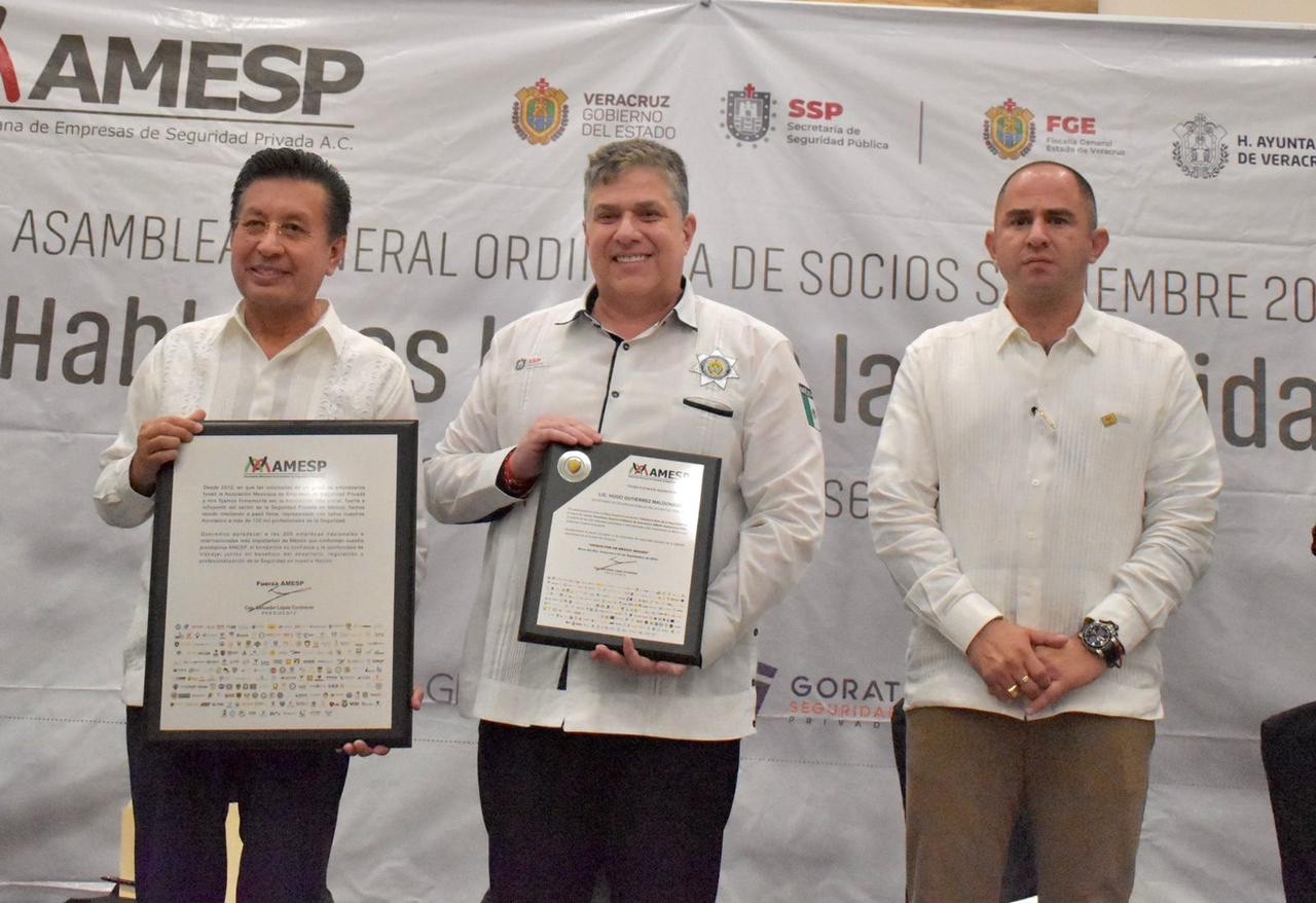 Durante la asamblea presidida por el presidente de AMESP, Salvador López Contreras y Rafael Abreu Ponce, presidente de la Comisión de Relaciones Institucionales y Enlace Gubernamental en el estado de Veracruz de la AMESP, el titular de la SSP, Hugo Gutiérrez Maldonado recibió el reconocimiento de los agremiados.
