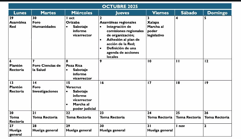 Xalapa, Ver.; 29 de septiembre de 2025.- Este lunes se celebró la Primera Asamblea General de la Red UV por la Legalidad, en las instalaciones del Instituto de Investigaciones Histórico-Sociales de la Universidad Veracruzana (UV), donde se definió un calendario de acciones de protesta, que incluye la toma de la Rectoría del 20 al 26 de octubre.