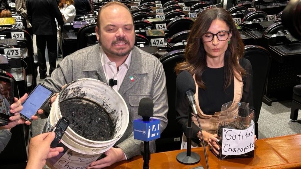 “Ya tiraron y derramaron el chapopote en el Golfo. No lo han limpiado ni aclarado ni ayudado a los pescadores ni prestadores de servicio, pero hace dos minutos, ya acaban de derramar por segunda vez el chapopote, y regaron la alfombra de la Cámara de Diputados llena de chapopote. La mierda que allá no levantan, aquí sí la tiran”, soltó.