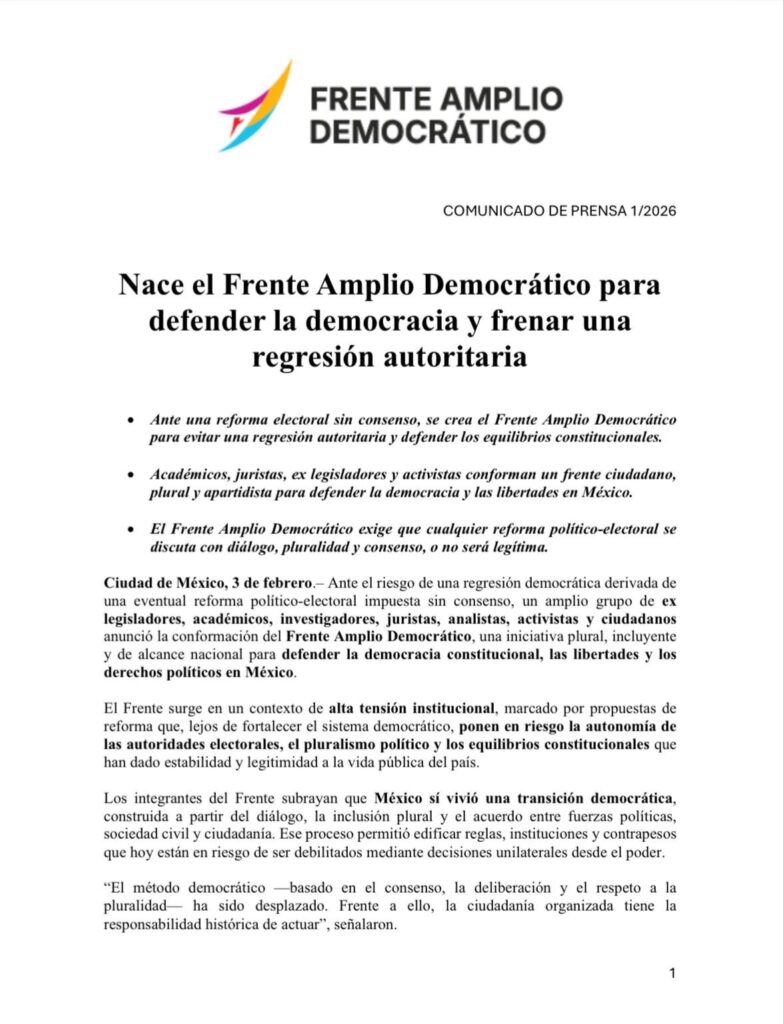 Redacción – Xalapa, Ver.; 3 de febrero de 2026.- Un grupo de académicos, juristas, activistas y ciudadanos anunció la creación Frente Amplio Democrático (FAD), con el objetivo de impedir la reforma electoral, bajo el argumento de que esta iniciativa representa riesgos para la estabilidad institucional del pluralismo en México,