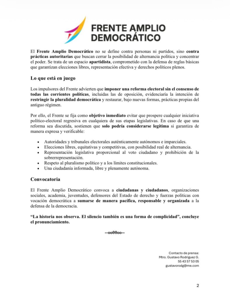Asimismo, aseguran que el frente no pertenece a ninguna ideología o partido y que no pretenden preservar privilegios ni un modelo fallido, sino proteger reglas básicas que garantizan libertades, derechos y representación efectiva ante la aplanadora de la 4T para sacar la reforma electoral sin la oposición.