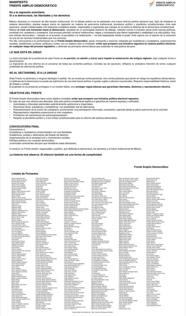 Entre los fiemantes del documento destacan el expresidente Vicente Fox, José Woldenberg, expresidente del otrora Instituto Nacional Electoral (INE); Lorenzo Córdova Vianello, expresidente del INE; la diputada panista Margarita Zavala; y Jacqueline Peschard, exconsejera del IFE, entre muchos más.