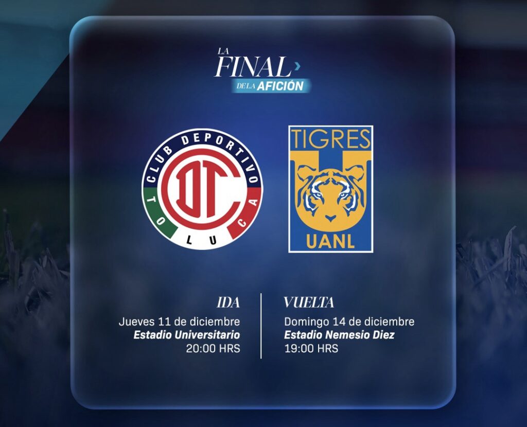 Redacción – Xalapa, Ver.; 8 de diciembre de 2025.- La Final del Apertura 2025 entre Toluca y Tigres, que será inédita, quedó definida en cuanto a fechas y horarios: se disputará eljueves en el Estadio Universitario (Volcán) y el domingo en el Nemesio Diez, tal como estaba previsto.